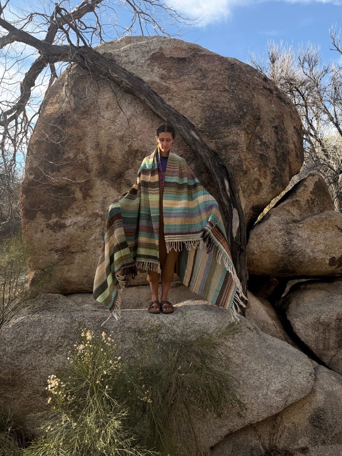 I'd also like to share a little about another of my newest creations, a large woolen blanket. This woolen blanket is inspired by the blankets woven by the Gaddi people in the Indian Himalaya. The Gaddi blankets are some of the first textiles to deeply inspire me. These simple, functional, beautiful blankets are the reason I started weaving. Frequently these blankets are woven in two or more narrower sections, hand stitched together using the stitch that you see here in this piece. You can find lots more photos of it here on my website.